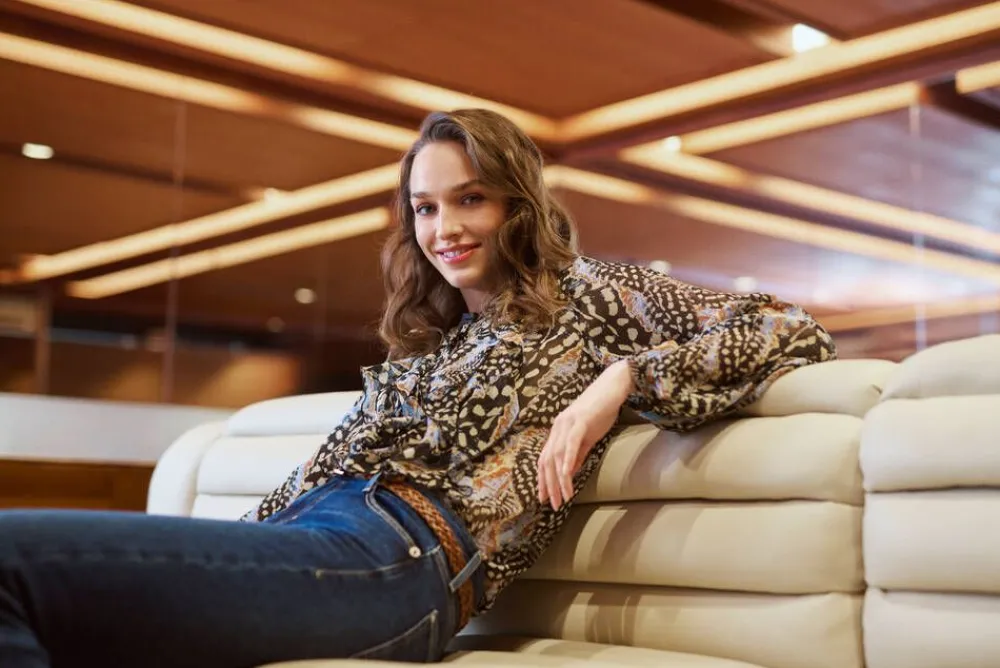 Naisellinen pitkähihainen kirjava printtipusero läpikuultavaa materiaalia. Edessä näyttävät röyhelöt ja nappikii…