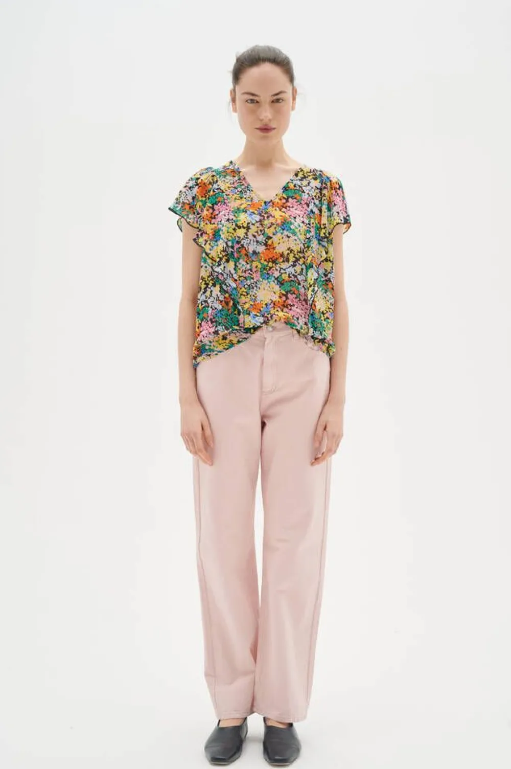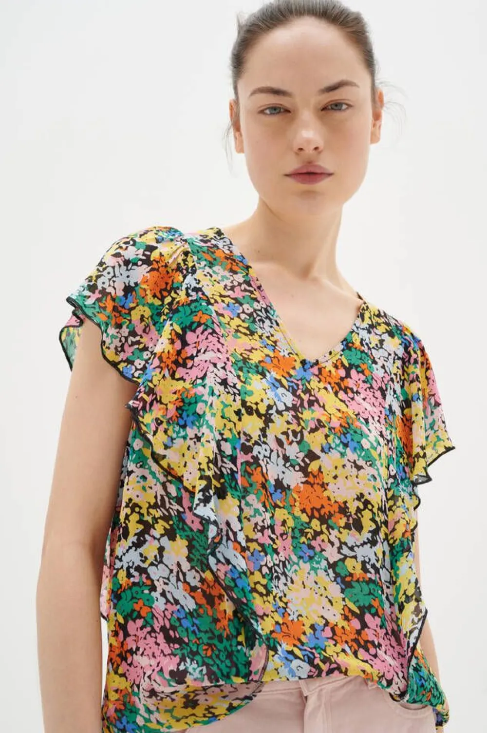 Naisten kauniisti laskeutuva pusero värikkäällä kukkakuosilla. Lyhythihaisessa puserossa on tyylikkäät frillat ede…