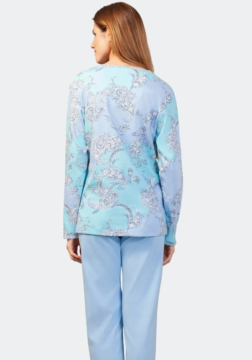 Hempeän värinen ja miellyttävä puuvillainen pyjama klassisella paisleyprintillä ja yksivärisillä kokopitkillä ho…