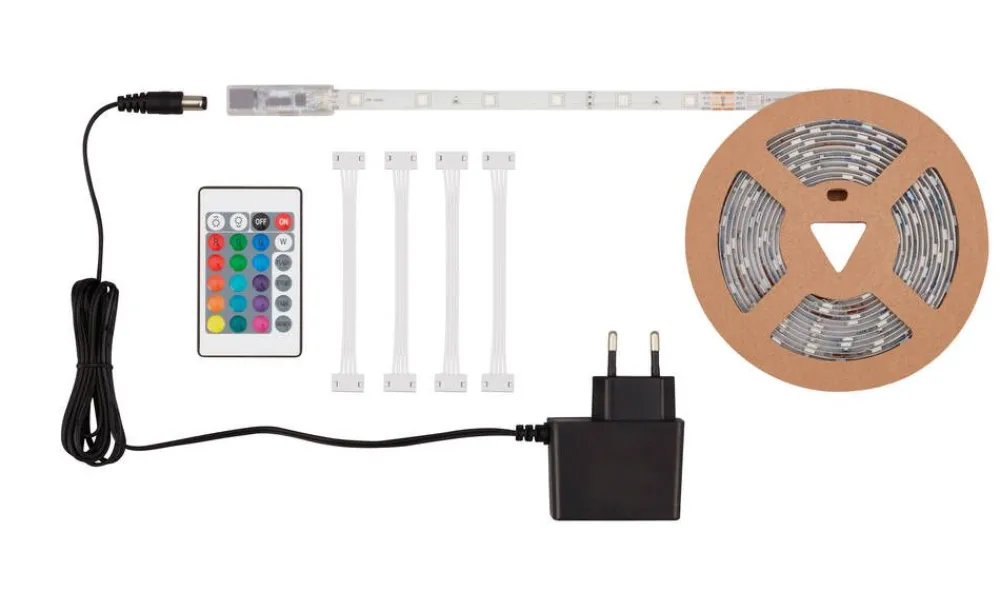 RGB LED valonauha 5 m liitosjohto 1,5m, värisävyn vaihto kaukosäätimelläLisää tietojaIP-luokka:IP20Kanta:Kiinteä…
