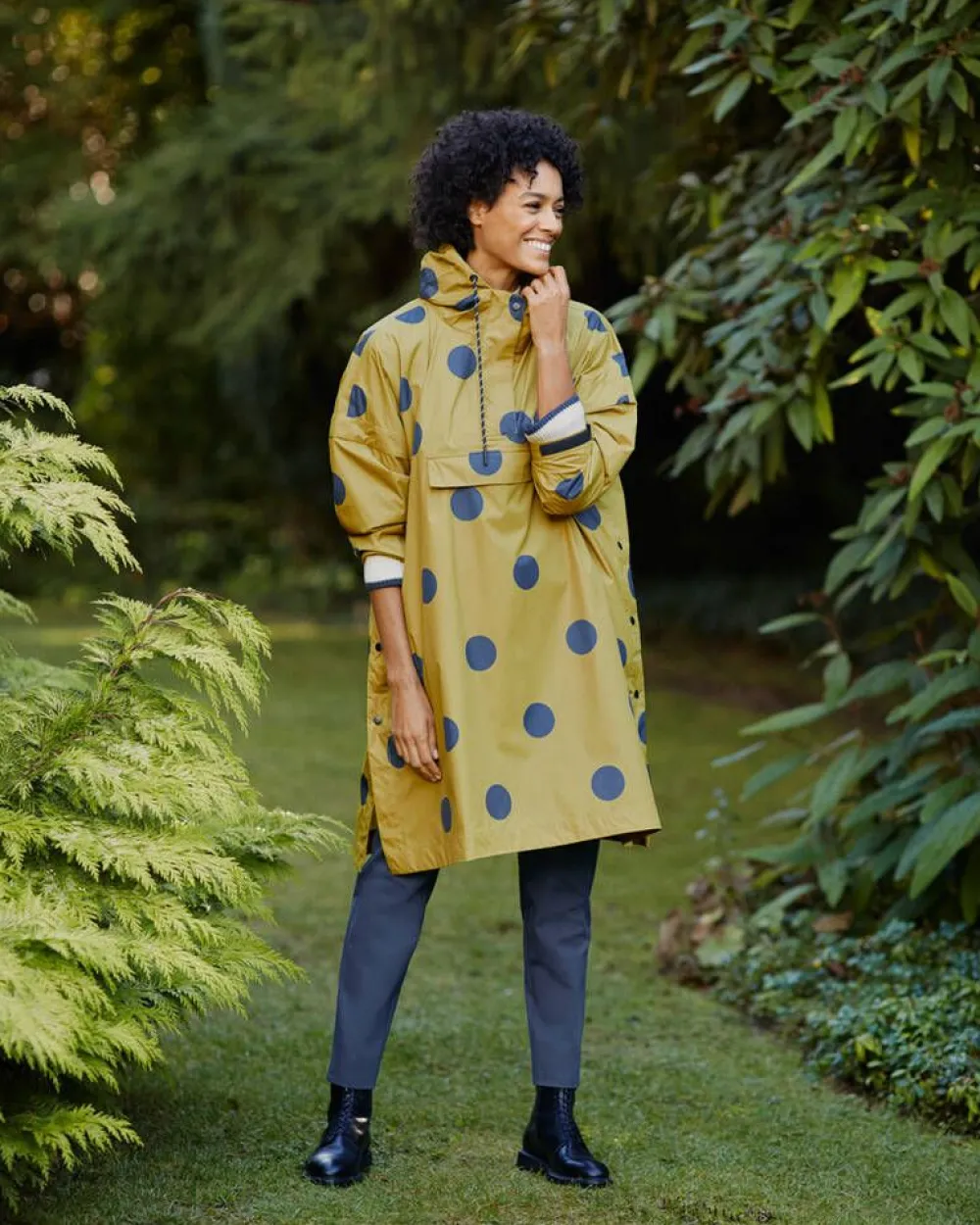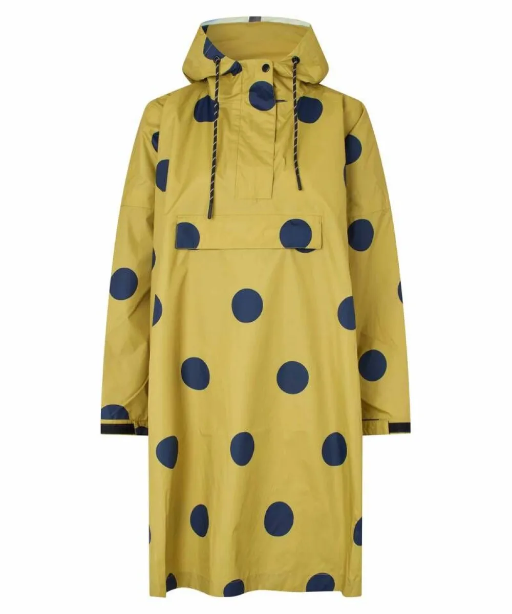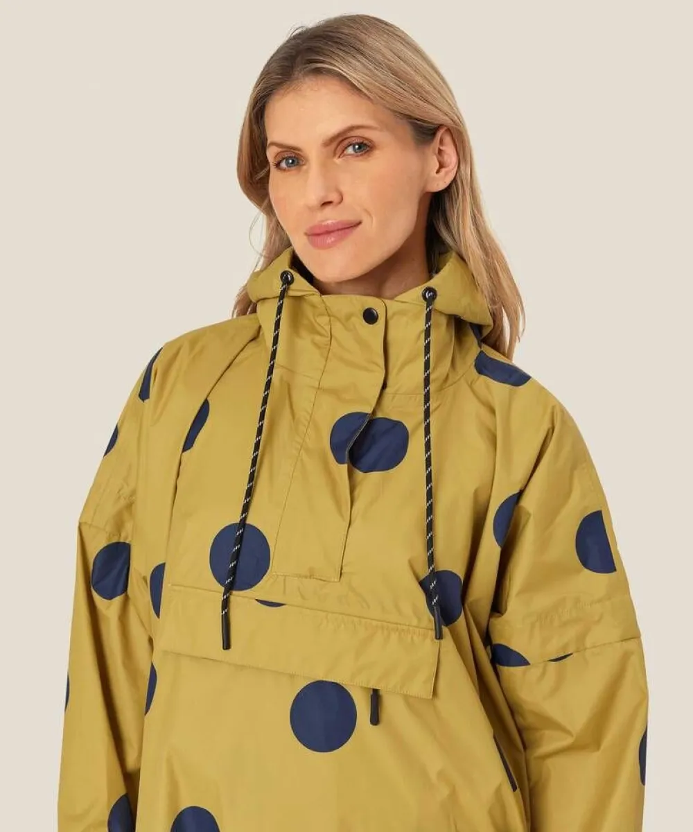 Leikkisä sadeanorakki. Väljä istuvuus ja polvipituinen malli. Hupussa on säätönarut. Sivusaumoissa on avattavat na…