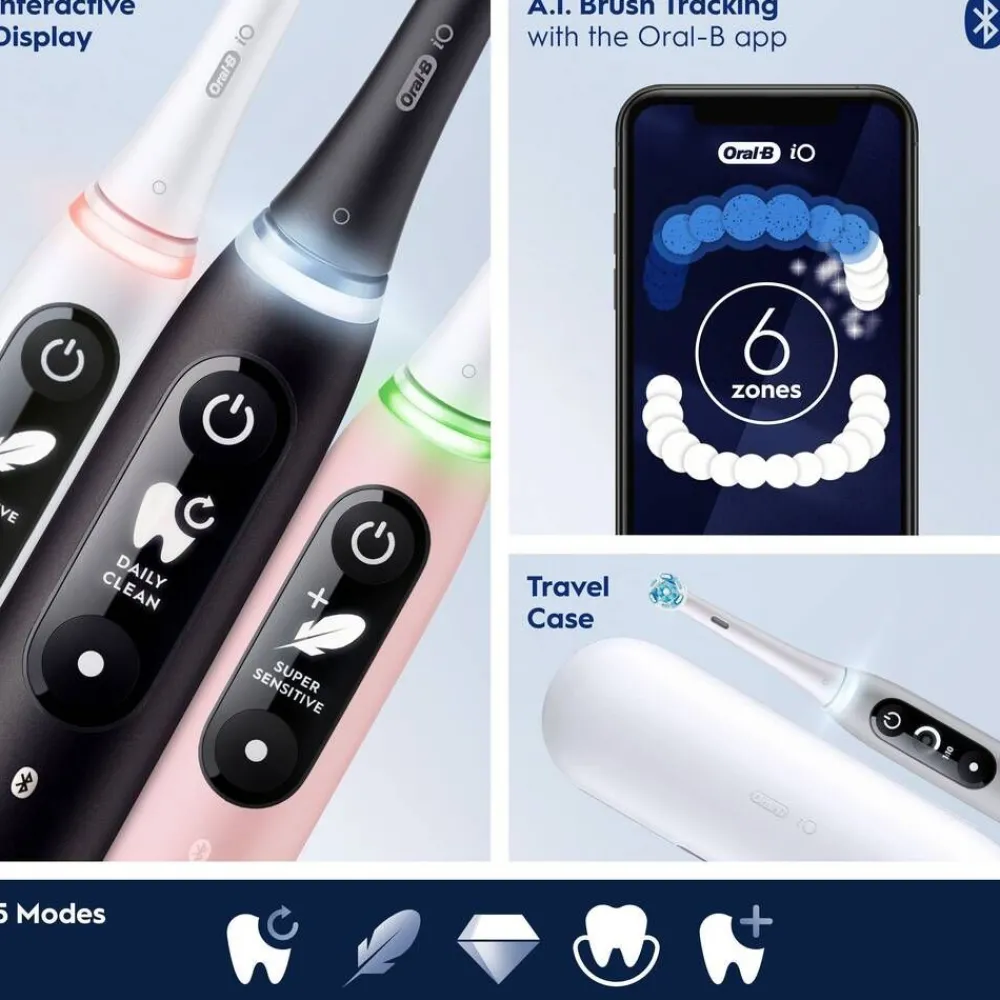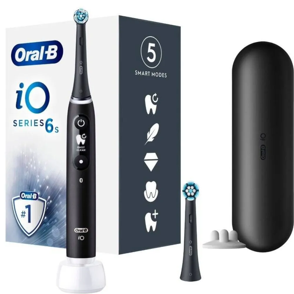 | Yhden myyntipakkauksen sisältö:1 iO6-runko-osa ja 2 vaihtoharjaa, 1 matkakotelo, 1 laturi, 2 vaihtoharjaan pidike |