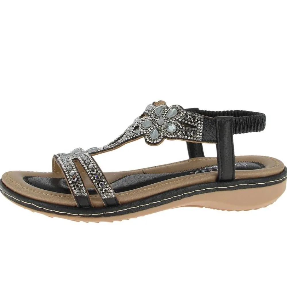 Näyttävät ja mukavat bling-bling -sandaletit venyke- ja t-remmeillä. Sisäpohja on muotoiltua ja pehmustettua syntee…