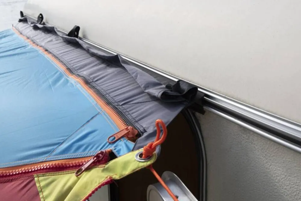Seinäkiinnike Bent katokselle. 4 kiinnikettä kattokiskoon. Leveys 250 cm. SBS vetoketju. Materiaali 150D polyesteri.Li…