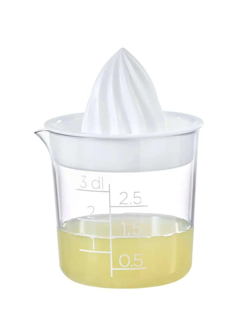 Moderni, läpinäkyvä sitruspuristin selkeällä mitta-asteikolla. Spiraalimuoto tekee mehun pusertamisesta helppoa ja …
