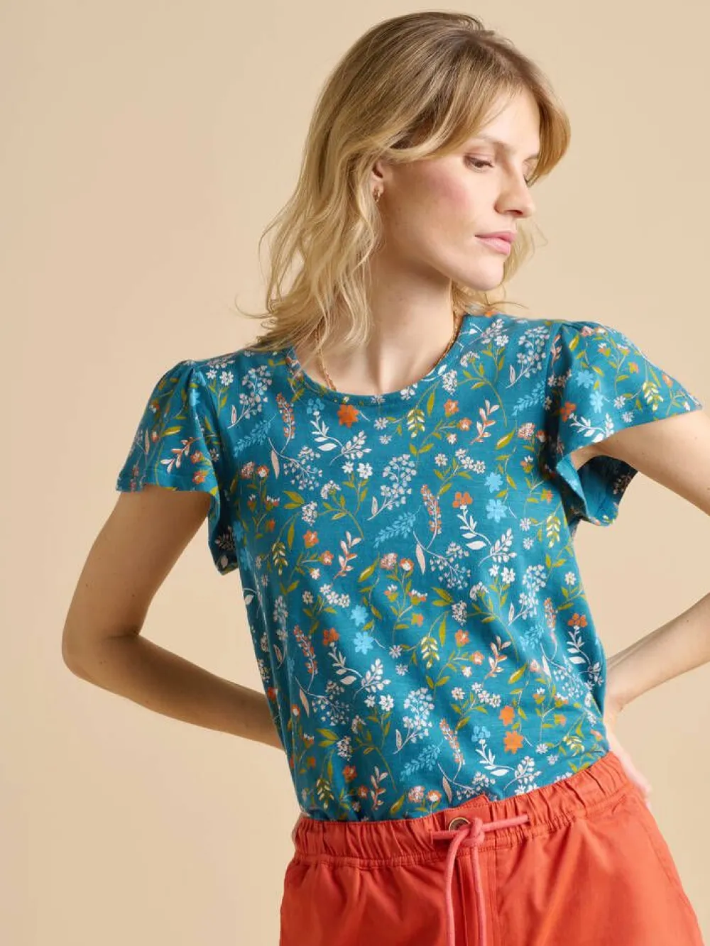 Värikäs kukkakuosillinen t-paita lyhyillä hihoilla, joissa on ilmavaa keveyttä.Lisää tietojaMalli on 170cm pitkä …