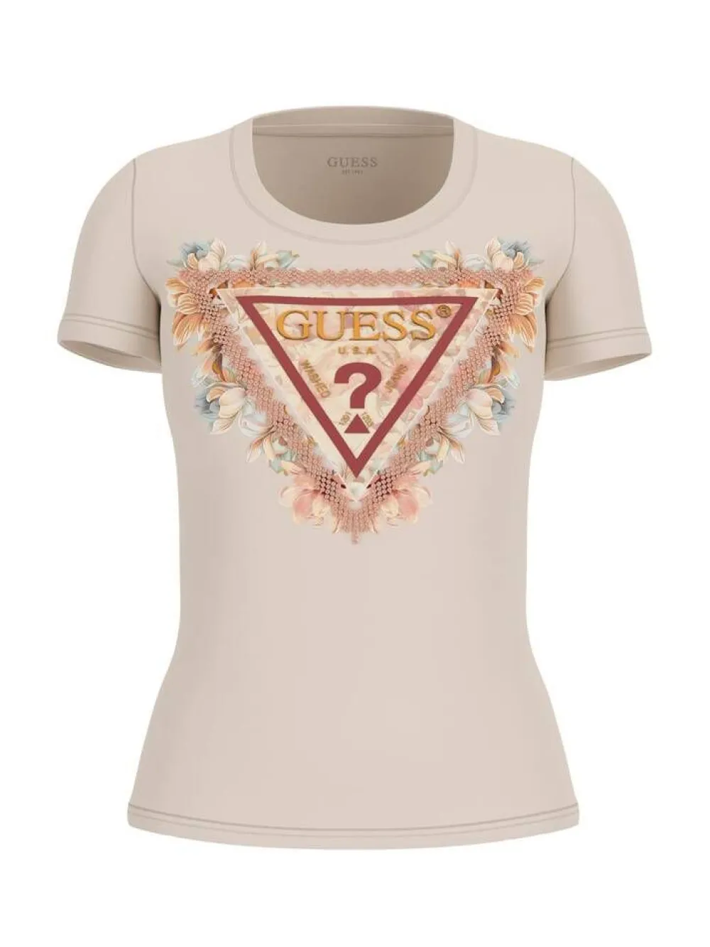Naisellinen tyköistuva t-paita suurella kukkakuvioisella Guess-kolmiolla.Lisää tietojaIstuvuus:Slim fitMateriaali:50%…