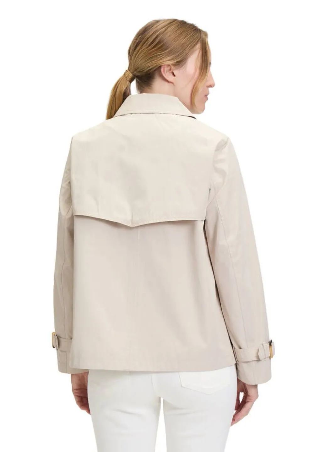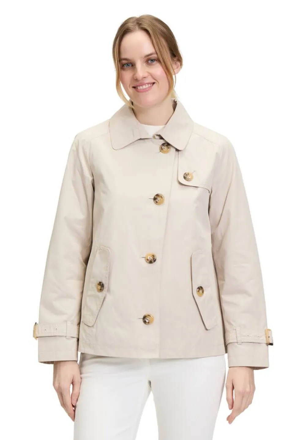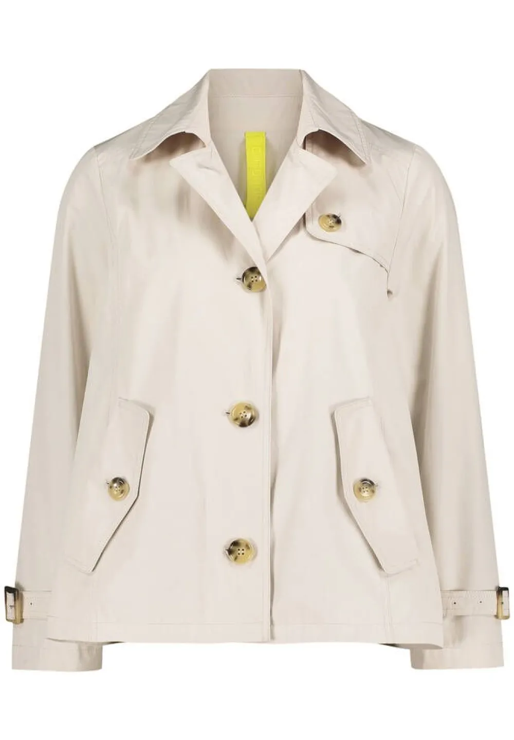 Klassisen tyylikäs lyhyt trenssitakki kauluksilla ja näyttävillä napeilla. Hihansuissa on säädettävät hihavyöt …
