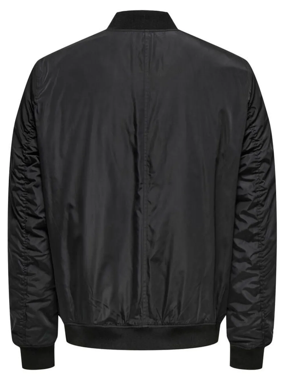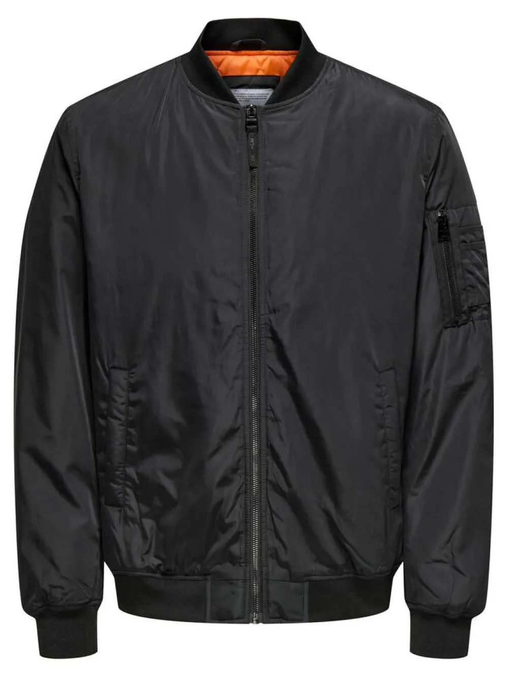 Monikäyttöinen bombertakki vetoketjukiinnityksellä, kirkkaanoranssilla vuorella ja sivutaskuilla. Toisessa hihassa my…