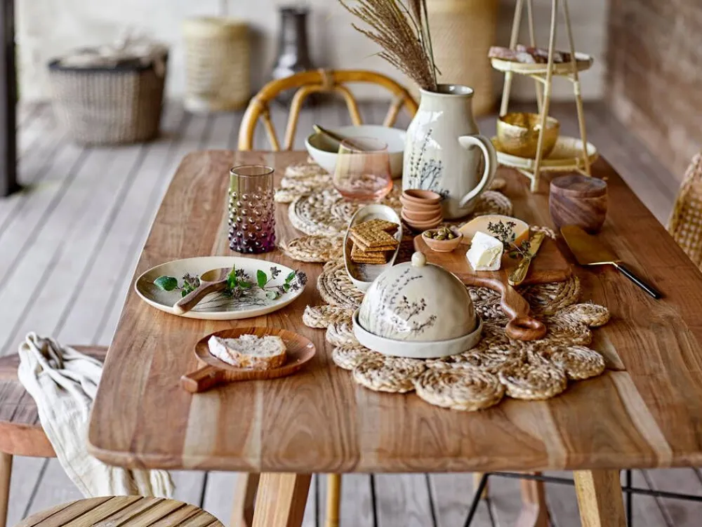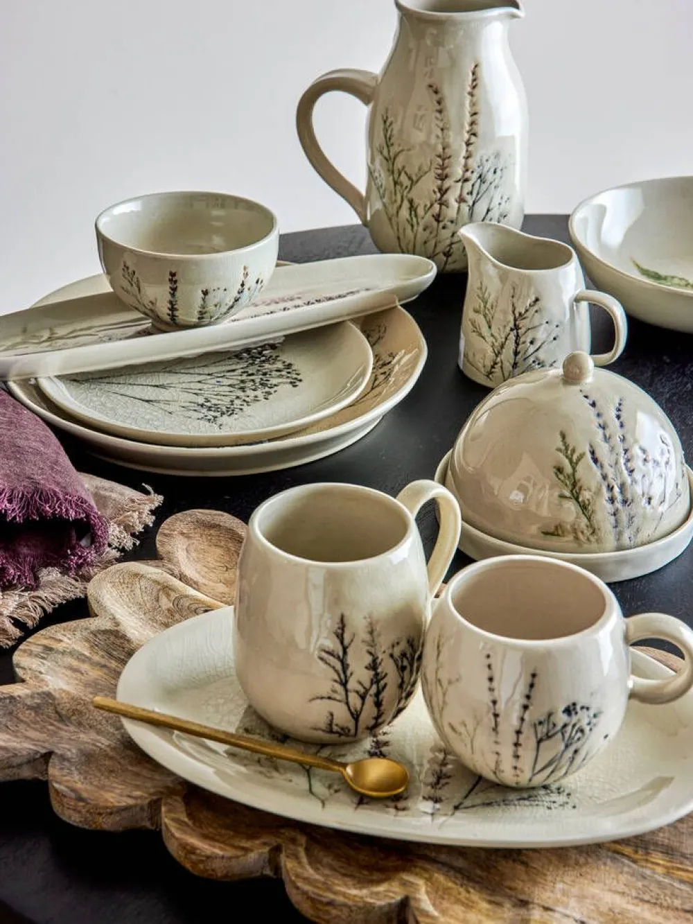 Bea-tarjoiluastia on kivitavaraa neutraaleissa sävyissä. Halkeilleen lasitteen päällä kulkee herkkä käsinmaalattu…