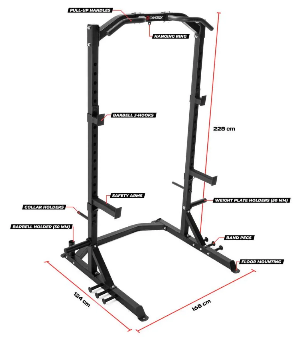 | Yhteensopivan painonnostotangon otepinnan minimi pituus 116cm. Turvaraudan pituus: 31cm. Tankopidikkeen pituus: 23cm. Runkoprofiili: 60 x 60 mm. Turvarauta/J-koukku alimmillaan 57,5cm ja ylimmillään 184cm. Reikien väli 7cm. |