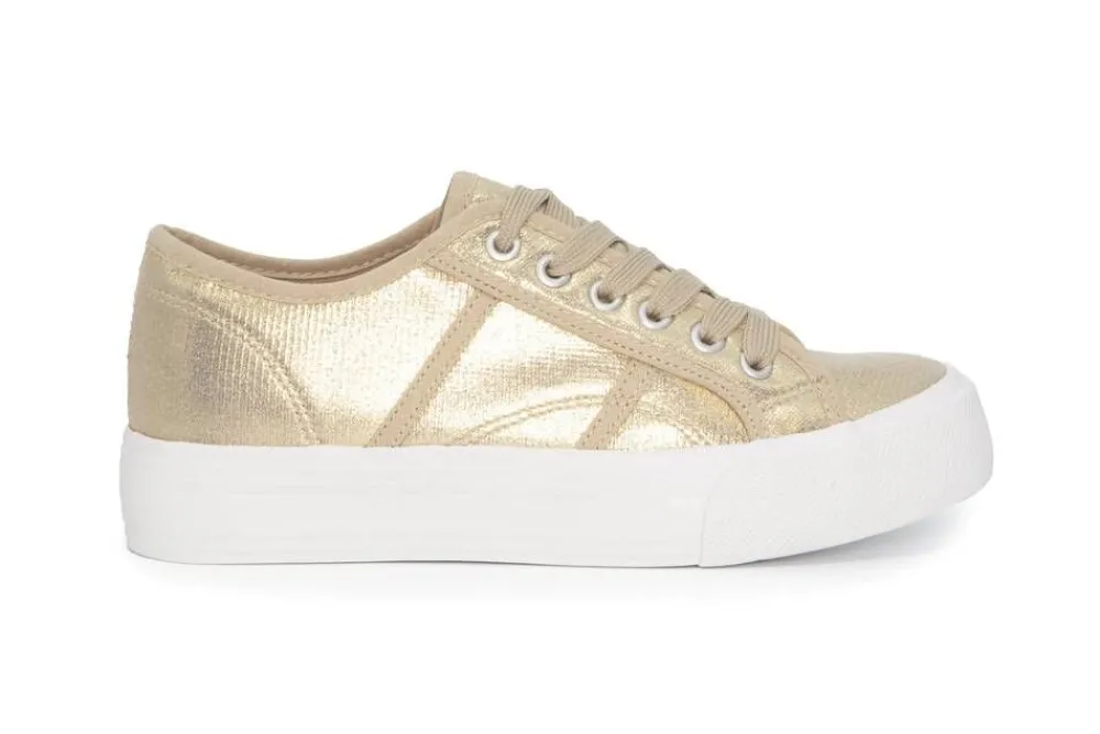 Klassiset ja hohdokkaat kultaiset tennarit paksulla pohjalla. Päällinen tekstiiliä ja ulkopohja kumiseosta.Lisää ti…