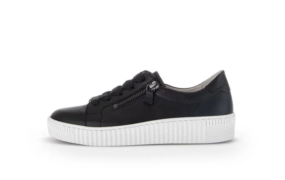 Naisten tyylikkäät ja monikäyttöiset mustat pintanahkaiset tennarit. Kengän molemmilla sivuilla pukemista helpottav…