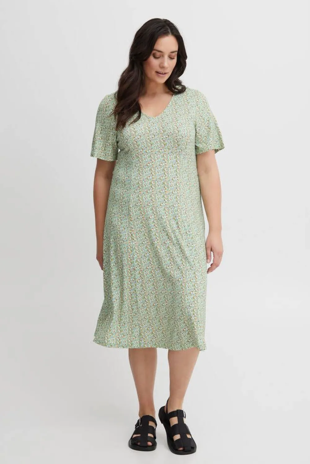 Joustava trikoomekko V-pääntiellä ja ihanalla kellohelmalla.Lisää tietojaPlus-mitoitusHoito-ohje:Vesipesu 30Materia…