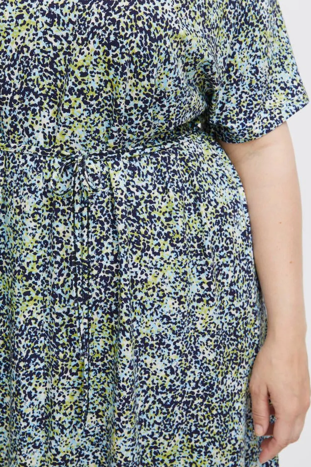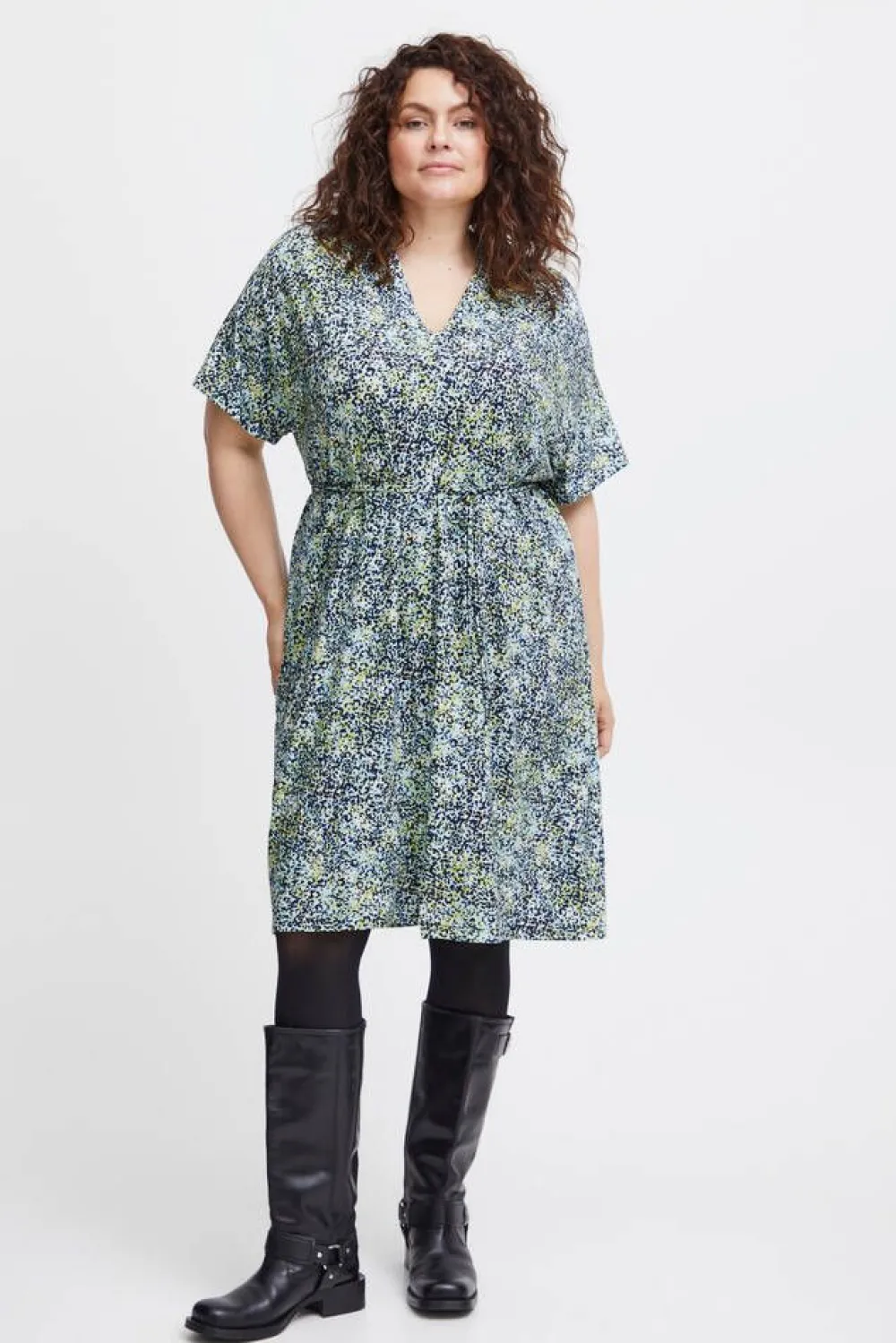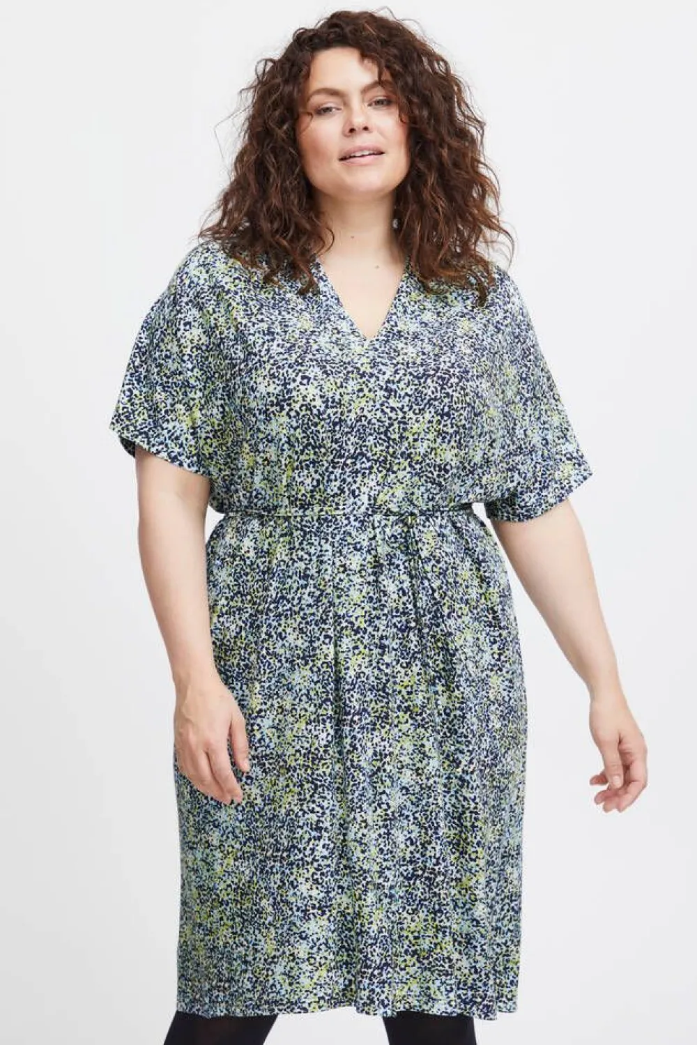 Pienitäpläinen trikoomekko V-pääntiellä ja lyhyillä hihoilla.Lisää tietojaPlus-mitoitusHoito-ohje:Vesipesu 30Mat…
