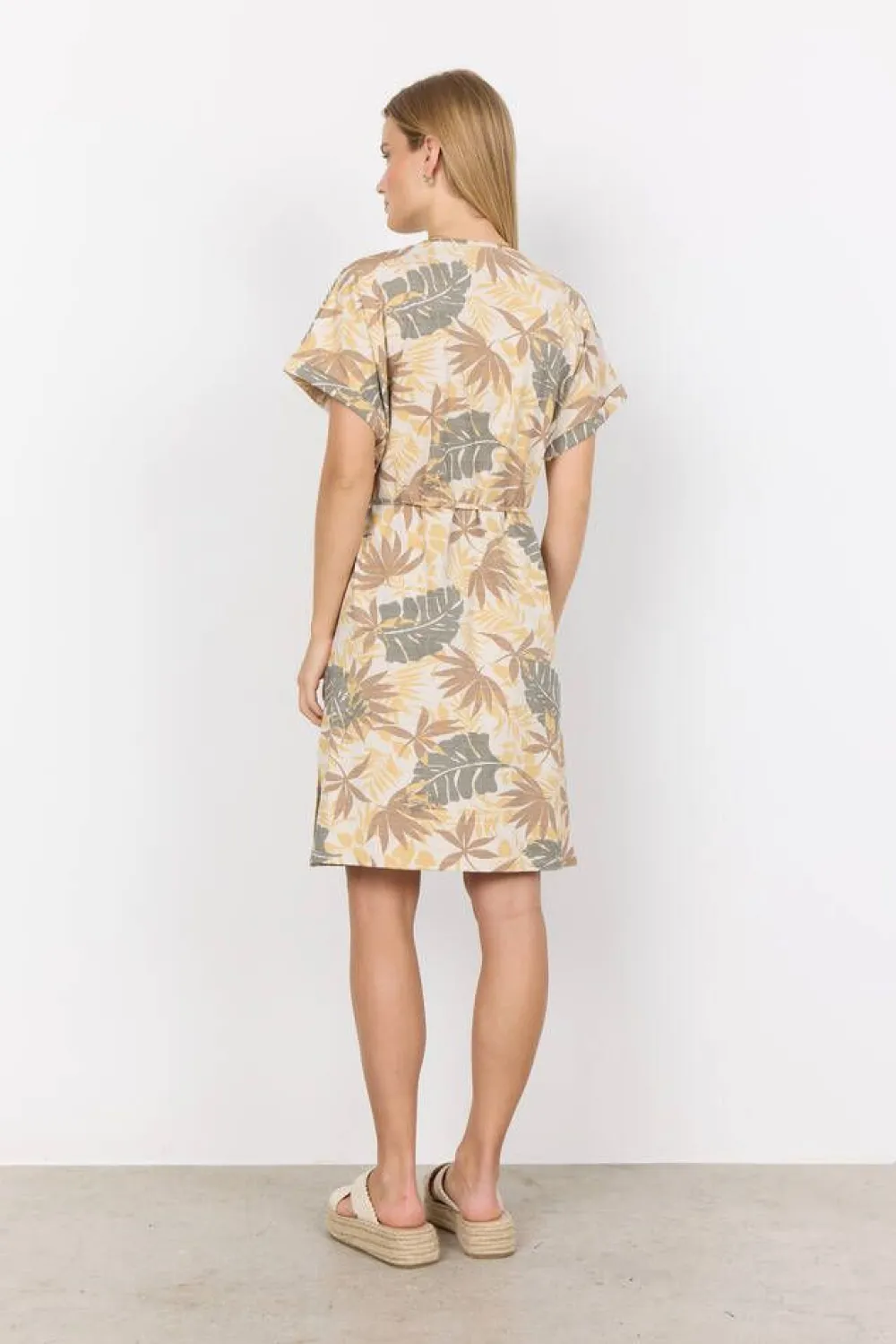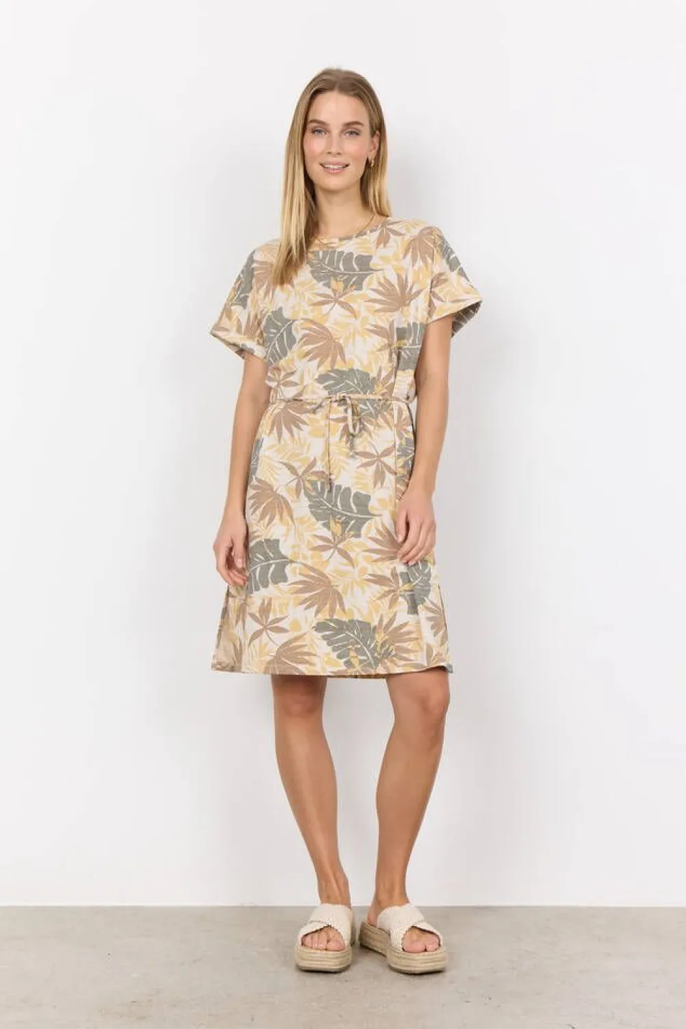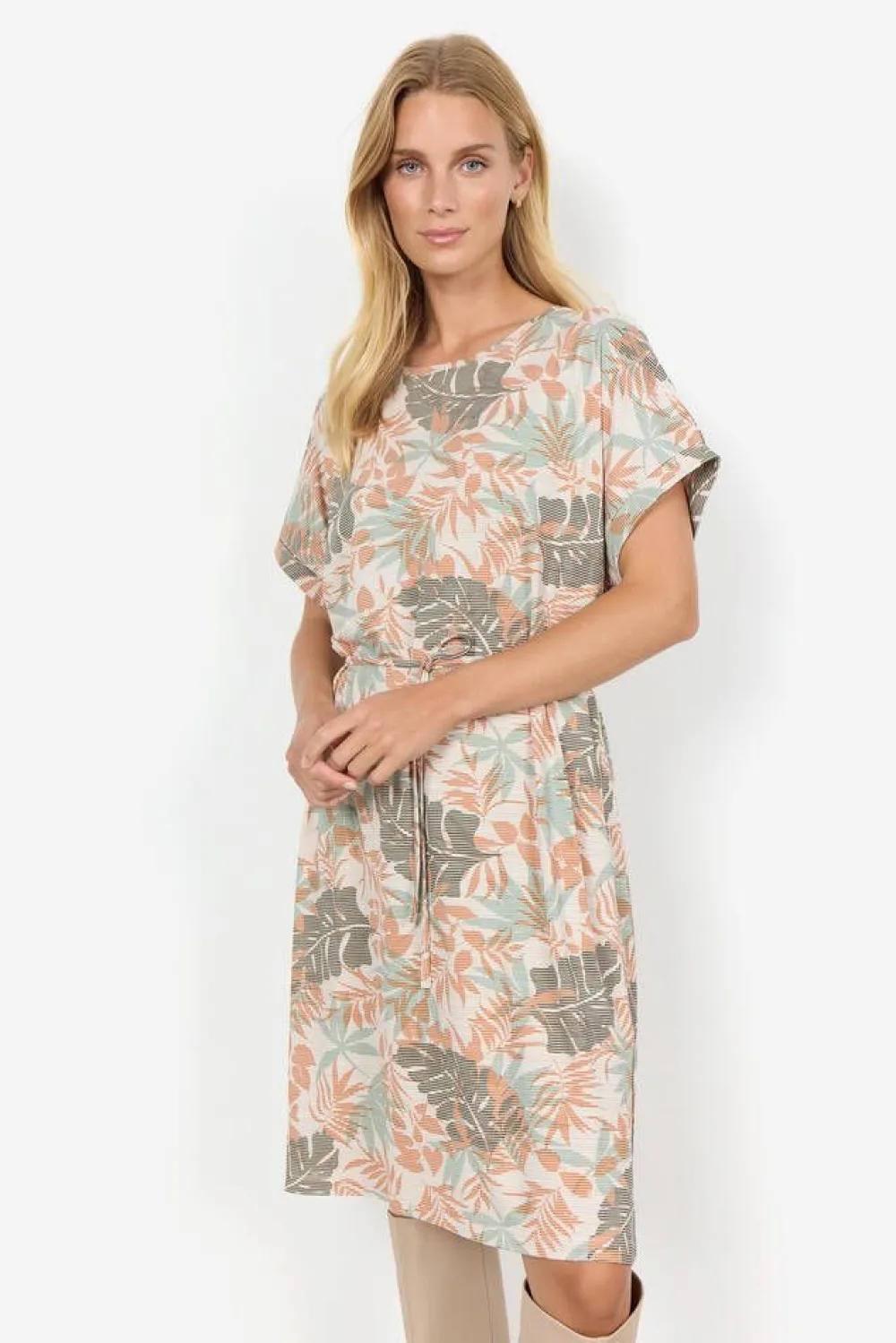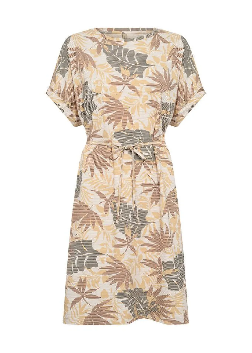 Lyhythihainen trikoomekko himmeällä raita-/lehtikuosilla ja käännetyillä hihansuilla. Vyötäröllä on solmittava …