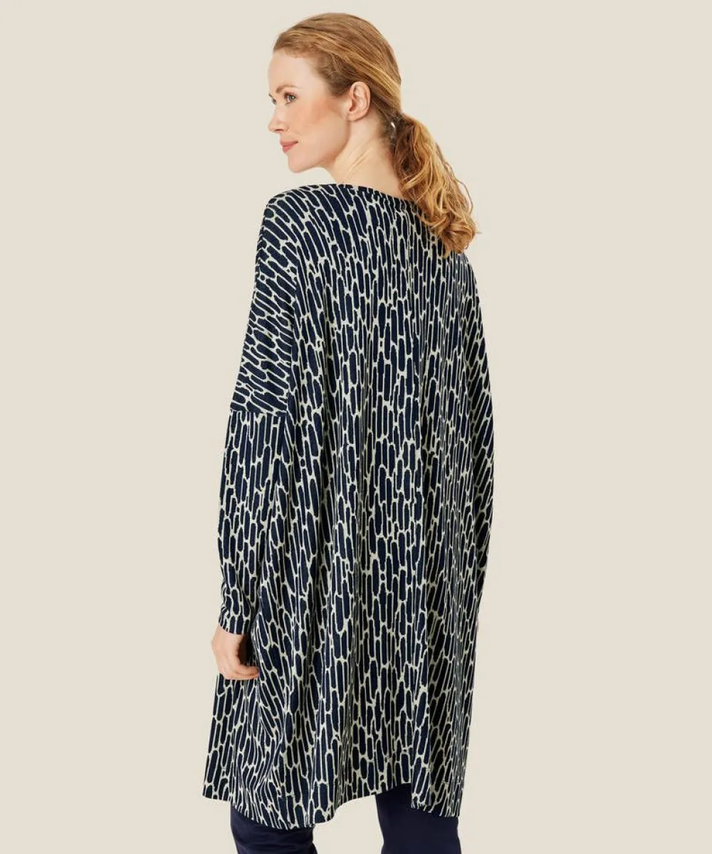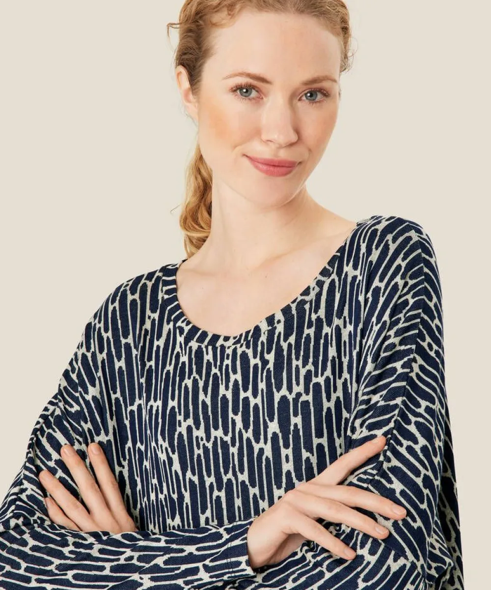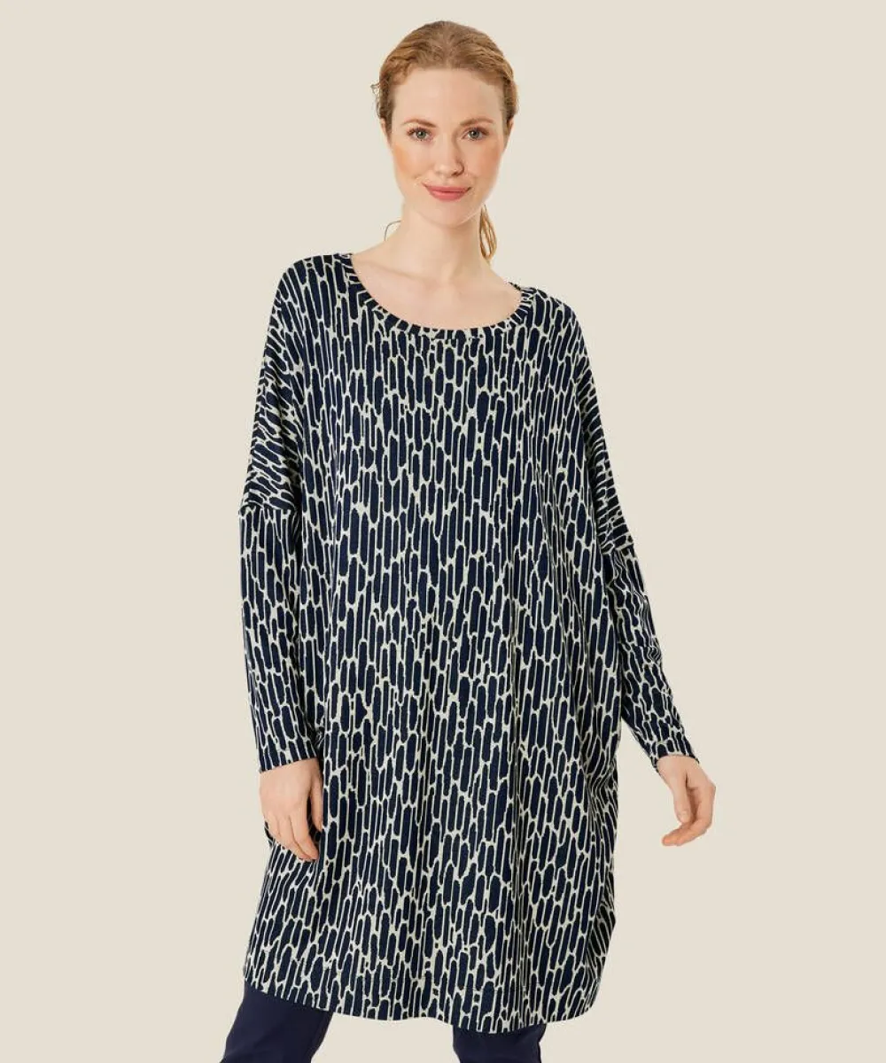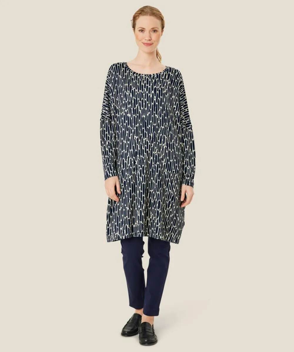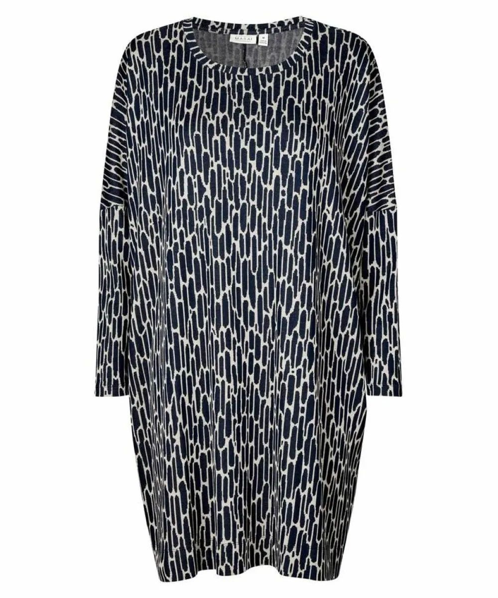 Rento trikoomekko sinivalkoisella kuosilla ja pudotetulla olkalinjalla.Lisää tietojaHoito-ohje:Vesipesu 30Materiaali:9…