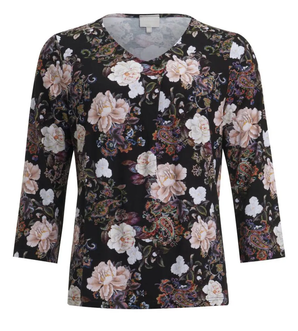 Joustava trikoopaita V-pääntiellä ja vajaamittaisilla 3/4-hihoilla. Kukkakuosisen paidan etupuolella on tyylikäs las…