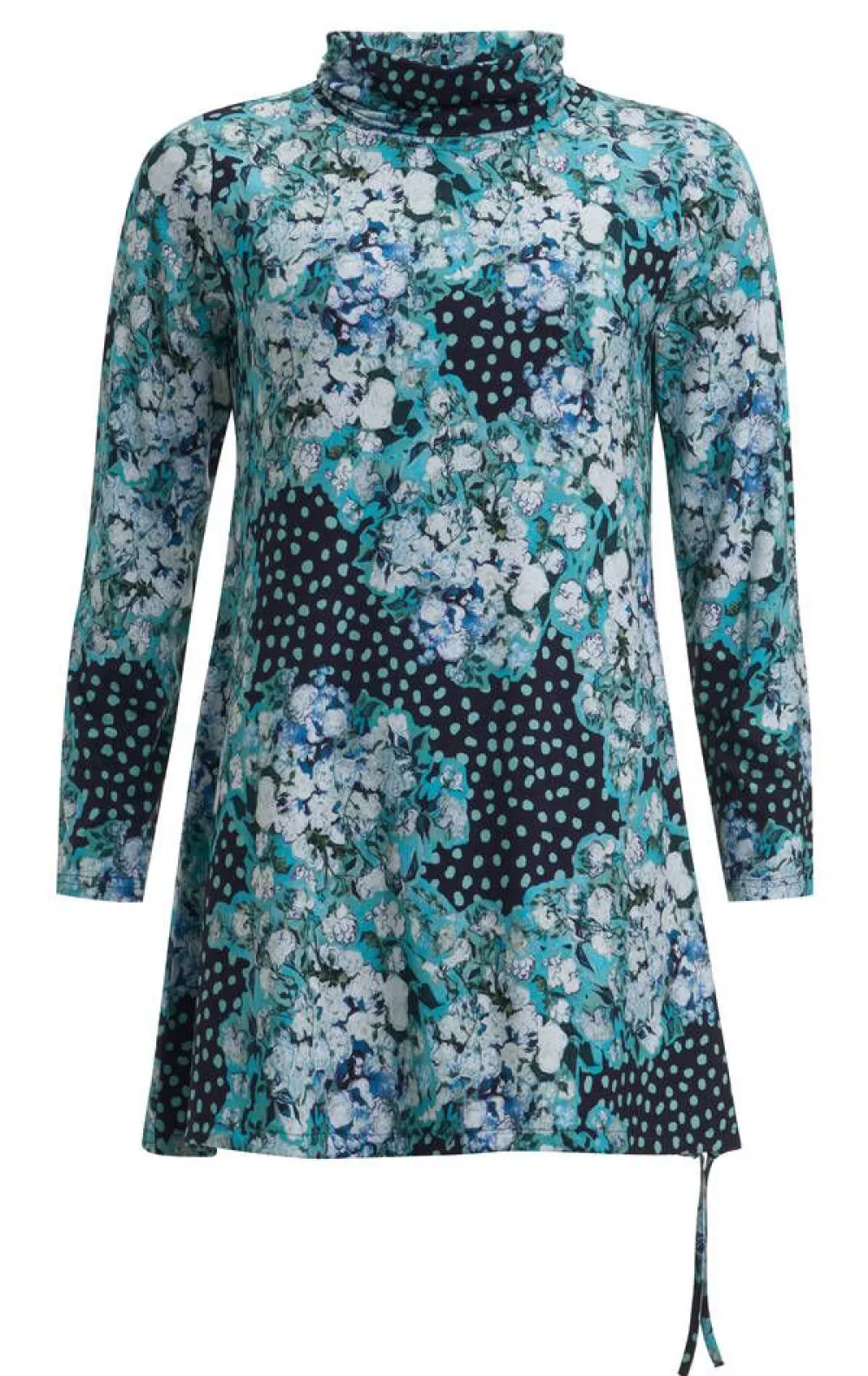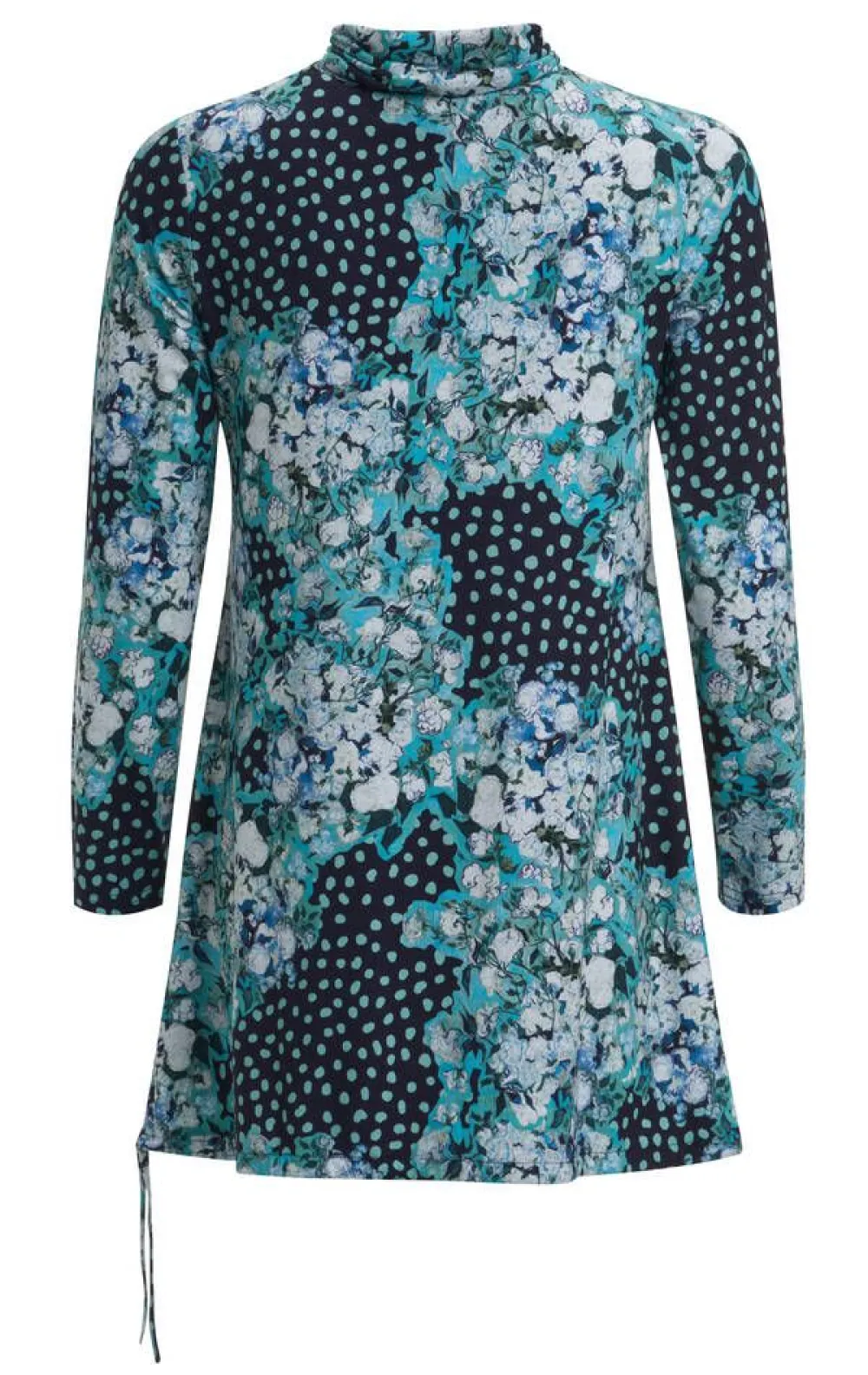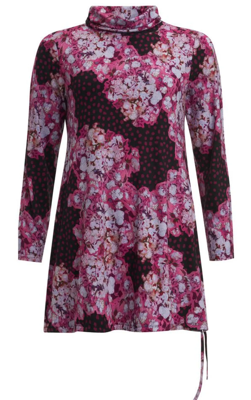 Pitkähihainen trikootunika mukavalla poolokauluksella. Kukkakuvioidun tunikan helmassa on solmittava kiristysnaru.Lisä…