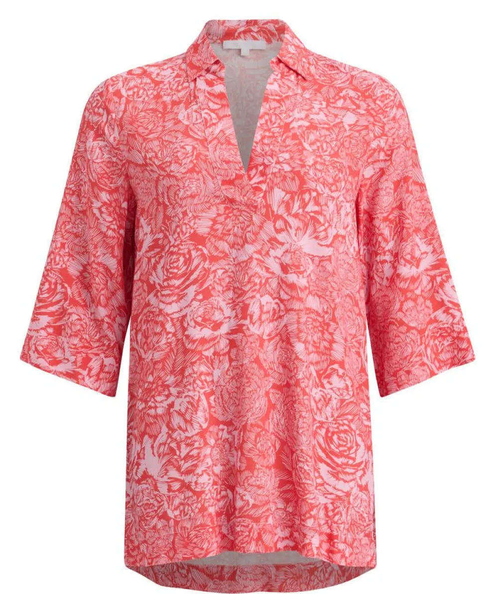 Trendikäs kauluksellinen kevyt tunika punaisella kukkakuosilla ja vajaamittaisilla hihoilla.Lisää tietojaMateriaali:1…