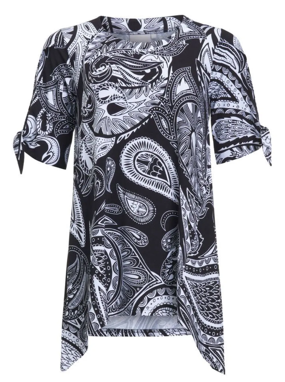 Paisleykuosinen trikootunika sivuilta pidemmällä hainpyrstöhelmalla. Lyhyissä hihoissa on solmittavat narut.Lisää …