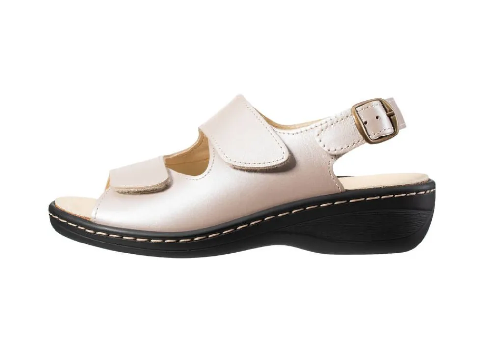 Naisten työsandaalit metallinhohtoisella nahkapinnalla. Sandaalien istuvuutta on helppo säätää kahden tarraremmin a…