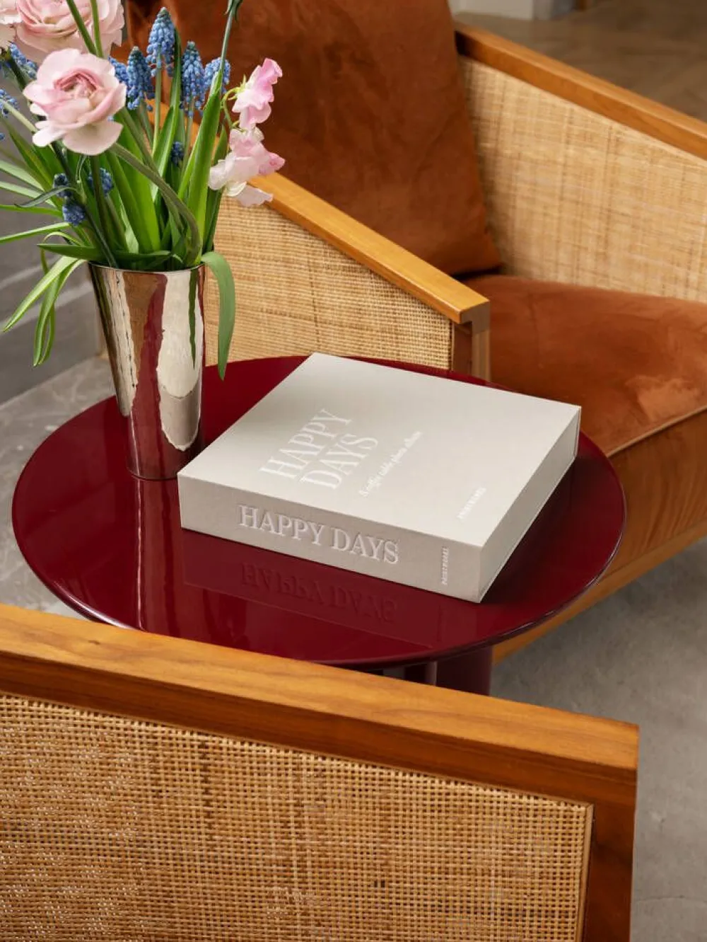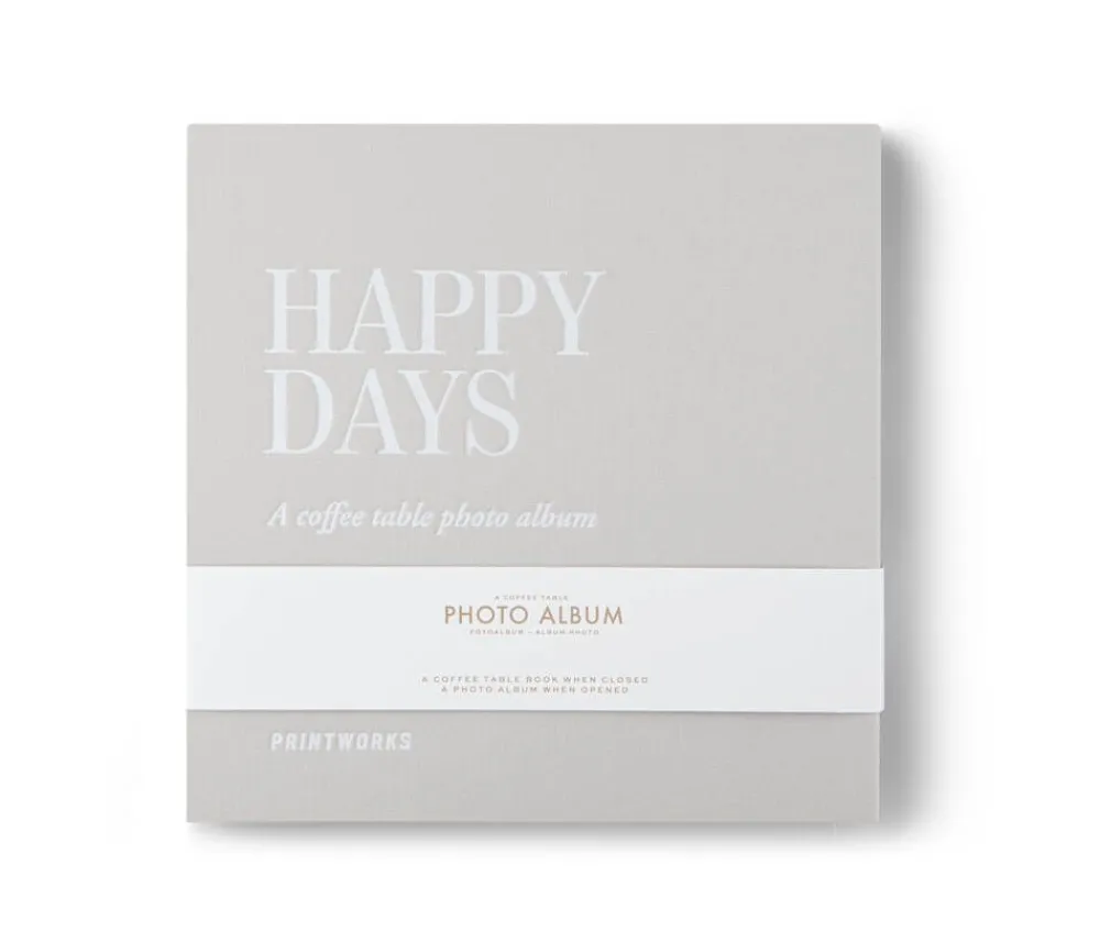 Tutustu Happy Days Coffee Table -valokuvakirjaan, jossa on elegantti vaaleanharmaa kangaspäällyste ja valkoinen teksti…