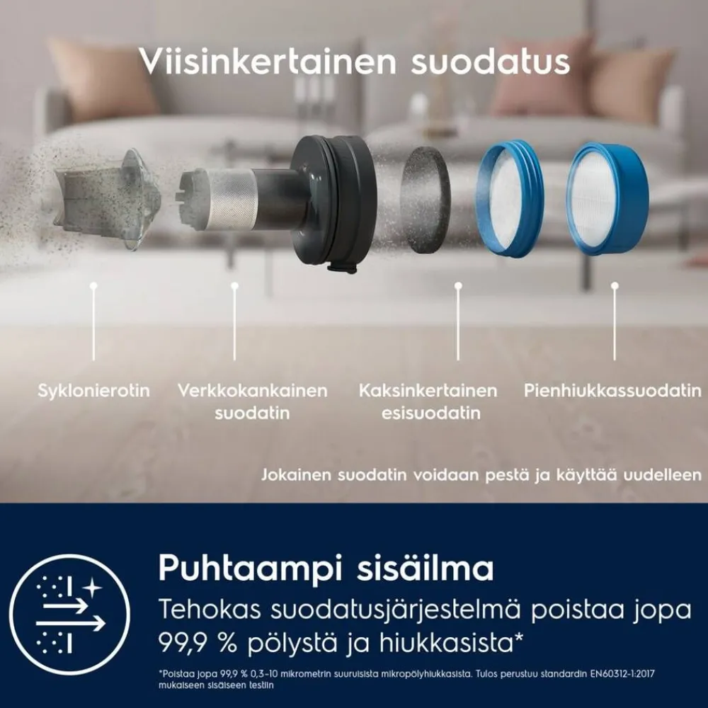 | Tekniset tiedot -Teknologia: Pussiton – Käyttöaika, minimi teho (min): 40 – Käyttöaika, normaali teho (min): 20 – Käyttöaika, max teho (min): 10 – Latausaika (h): 4,5 – Akun kapasiteetti (mAh): 4000 – Akun jännite, tyyppi: 14.4V, Li-ion – Imuteho (W): 95 – Ilmanvirtaus, käsi-imuri (l/s): 12.5 – Ilmanvirtaus, koko imuri (l/s): 11.5 – Äänitaso dB(A): 80S – Suodatustapa: Kaksinkertainen suodatus – Säilytys: Seinäteline – Mitat: 100,8x25x25,9 – Mitat, käsi-imuri: 43.3×8.8×23.5 – Paino (kg): 2.2 – Paino, käsiosa (kg): 1.3 – Tuotenumero (PNC): 900 402 141 – EAN-koodi: 7332543971534 |