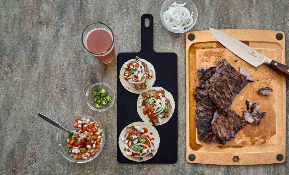 Victorinoxin Handy-leikkuulauta on valmistettu astianpesukoneen kestävästä, ympäristöystävällisestä paperikomposiittimateriaalista, joka luontaisen kimmoisuutensa (””natural bounce””) ansiosta on erittäin hellä veitsen terälle. Leikkuulauta kestää 175 °C:n kuumuuden, joten sitä voi käyttää myös pannunalusena. Käytännöllinen kahva helpottaa paitsi tarjoilua myös pilkottujen raaka-aineiden siirtämistä pannulle. Kahvan ripustusreiästä leikkuulauta on kätevä ripustaa roikkumaan. Materiaali koostuu paperiarkeista, jotka prässätään yhteen tasaisen lämmön ja paineen avulla. Lopputuloksena on vankka, tasapainoinen ja kestävä materiaali. Tuotteet valmistetaan Epicureanin tehtaalla Wisconsinissa USA:ssa. Kaikki tuotantoprosessin aikana syntyvä jäte ja ylijäämämateriaali pyritään minimoimaan, käyttämään uudelleen tai kierrättämään aina kun mahdollista. Myös lämpö otetaan talteen ja käytetään varastotilojen lämmittämiseen talvella. Materiaalilla on mm. GREENGUARD- ja FSC® -sertifikaatit.