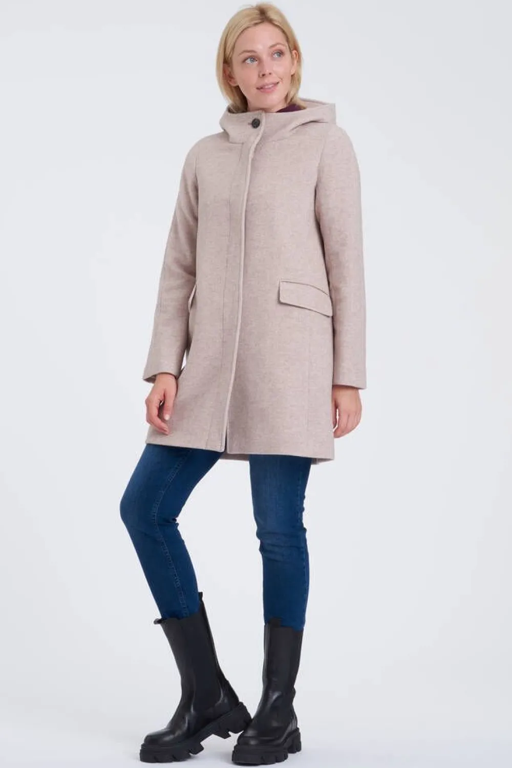 Hupullinen villakangastakki nappikiinnityksellä ja etupuolen tilavilla läppätaskuilla.Lisää tietojaMalli käyttää…