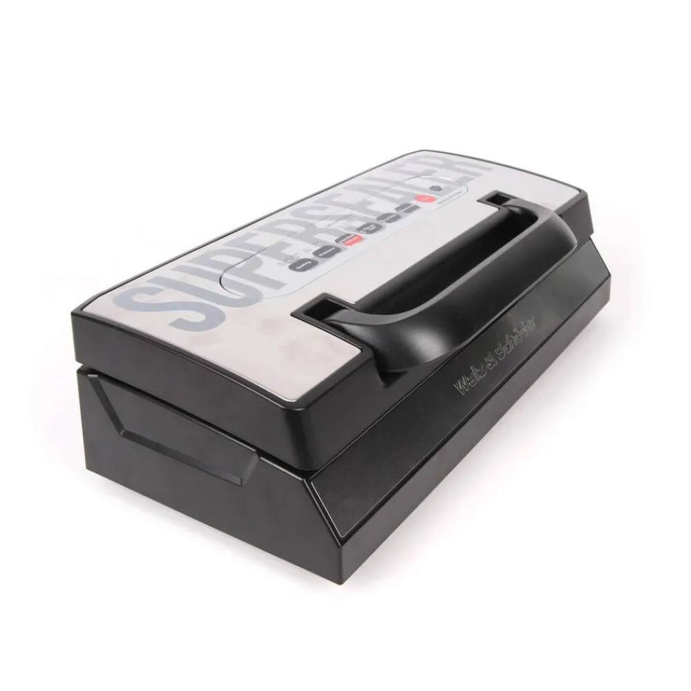 | Säiliö ja leikkuri: Tässä tyhjiöpakkauskoneessa on sisällä integroituna säilytyslokero johon voi kätevästi sijoittaa max 30 cm leveän vakuumiputkirullan. Koneessa on myös leikkuri jolla sopivan pätkän leikkaaminen käy käden käänteessä. Nestekaukalo ja kannnen kiristys: Walz Schöder vakuumikoneessa on sisällä kätevä, irrottettava ja puhdistettava kaukalo, jonka tarkoitus on kerätä tyhjiöpakkaamisen aikana irtoavat nesteet talteen niin, etteivät ne pääse koneen sisälle. Tämä on erittäin tärkeä ominaisuus, jotta koneen käyttöikä saadaan mahdollisimman pitkäksi. Mikäli neste pääsee vakuumikoneen pumppuun se voi aiheuttaa vaurioita pumppuun. Koneen kannen suljenta tapahtuu uudenlaisen kahvamallisen sulkimen avulla. Tämä kahva malli varmistaa sen, että koneen kansi on varmasti suljettuna, kun konetta käytettään joka taas varmistaa onnistuneen tyhjiöpakkaamisen. Perinteisiin sivusta aukaistaviin malleihin nähden luotettavuus on paljon parempi. |