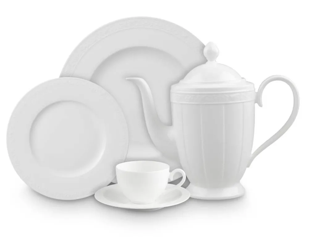 White Pearl astiasto on ylellistä, vitivalkoista luuposliinia. Koristeluna lautasosissa kaunis reliefikoristelu. Ohuude…