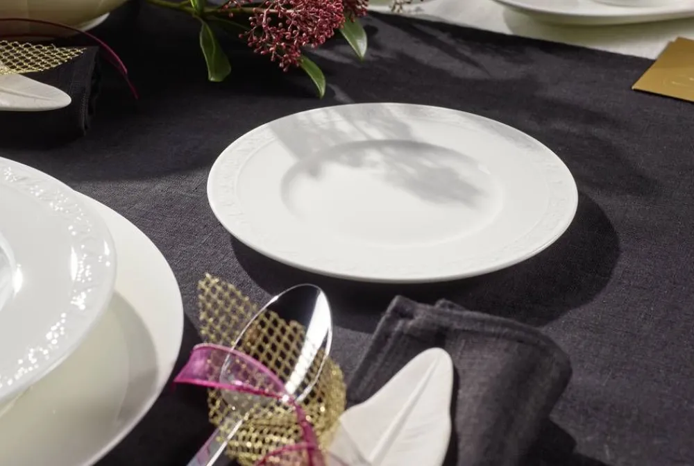 White Pearl astiasto on ylellistä, vitivalkoista luuposliinia. Koristeluna lautasosissa kaunis reliefikoristelu. Ohuude…