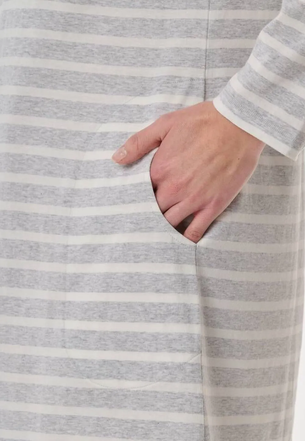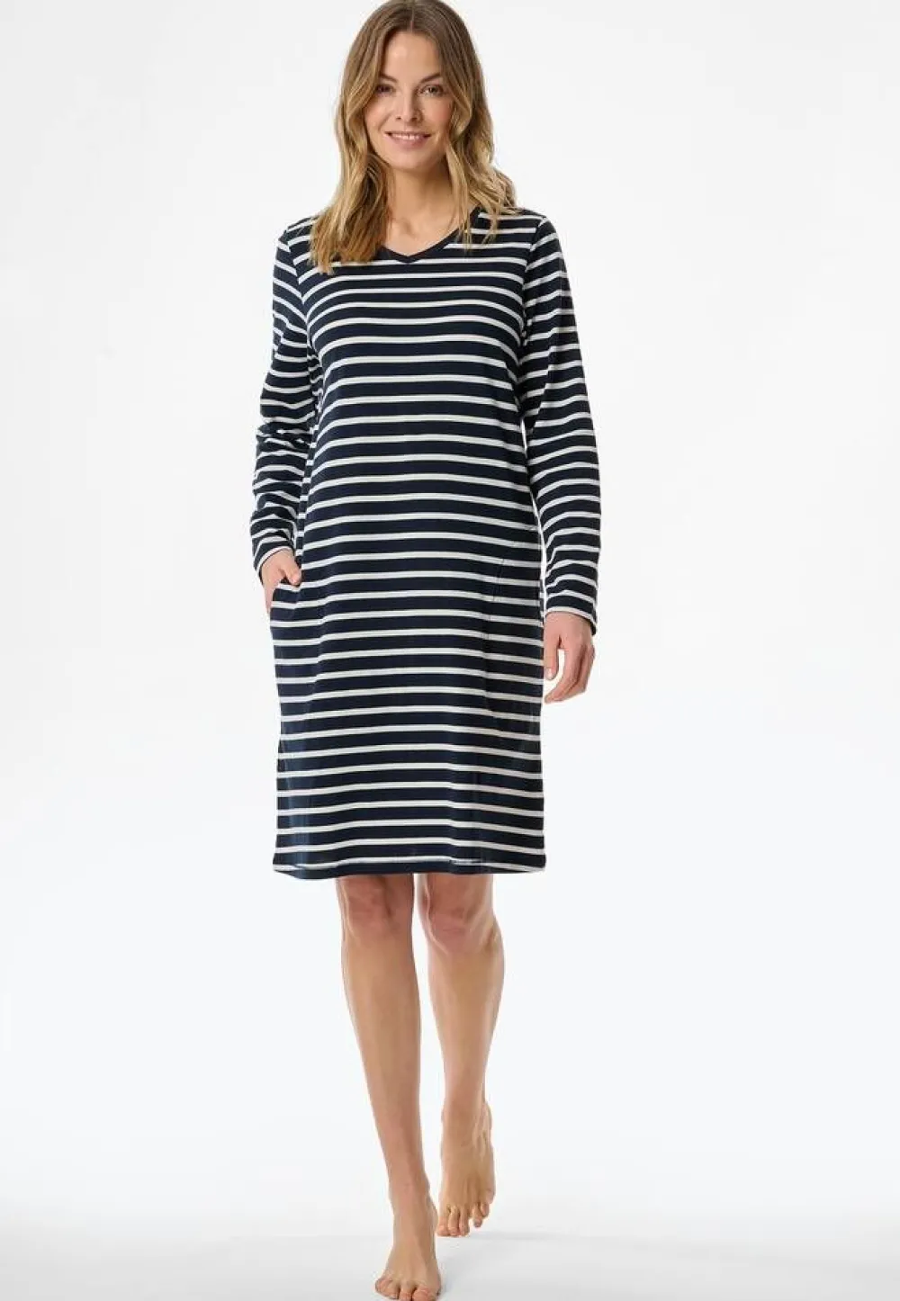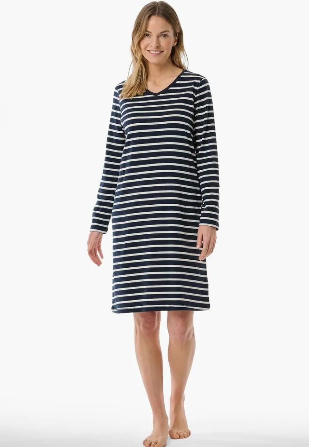 Raidallinen yöpaita V-pääntiellä ja pitkillä hihoilla. Vyötäröllä on kätevät avotaskut.Lisää tietojaKeskita…